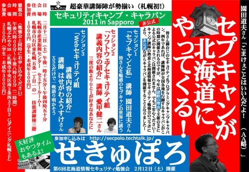 …というわけで、id:sonodam さん、id:kenjiaiko さんと3人でキャラバンやります!みなさんのご参加お待ちしています。 第6回北海道情報セキュリティ勉強会 - 北海道情報セキュリティ勉強会