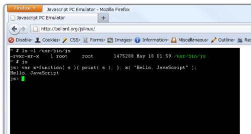 というわけで、昨日から話題沸騰の Javascript PC Emulator すごいですね。JavaScript で書かれた x86 PC エミュレータ上で Linux 動かして、入ってる tcc 使えばそこそこのソースもコンパイルして動いたり。 もとのディスク容量が少ないので、適当な母艦を…